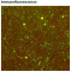 Immunofluorescence for the active Rac using Anti Active Rac1 GTP Mouse Monoclonal Antibody [26903] shows Rac GTP immunolabeling (green) in combination with cofilin (red) on brain tissue sections. The tissue sections were fixed with -20 ºC methanol or 4% paraformaldehyde (fixation time 1hr) and stained with antibody at 1:1000 in 0.1M Phosphate buffer with 0.3% Triton X, and 4% BSA for 24h at room temperature. Secondary antibodies were anti mouse AlexaFluor488 and anti rabbit AlexaFluor594 at 1:1000. |