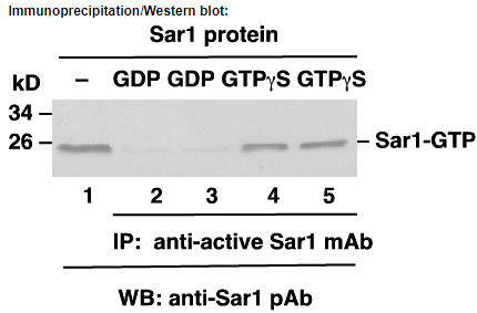 Sar1 activation assay. Purified Sar1 proteins were loaded with GDP (lanes 2 and 3) or GTPγS (lanes 4 and 5). Immunoprecipitation was done with the anti active Sar1 monoclonal antibody (Cat. No. 26916). Immunoblot was with an anti Sar1 rabbit polyclonal antibody (Cat. No. 21090).