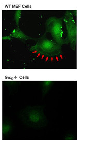 Immunofluorescence of mouse embryonic fibroblast (MEF) cells. Wild-type MEF cells (top panel) and Gα13 double knock-out cells (Gα13 -/-, bottom panel) were fixed and stained with anti-Gα13 polyclonal antibody (Cat. # 21005). Arrows indicate the dorsal ruffle strcture of one cell. |