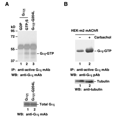 圖 A:CHO細(xì)胞轉(zhuǎn)染的野生型Gαi,用 GDP處理(lane 1)和用GTPγS處理(lane 2)以及活化的Gαi-Q204L (lane 3)用抗活性的Gαi單克隆抗體(Cat.No.26901)免疫親和沉淀,用anti- Gαi mouse monoclnal antibody (Cat.No 26003). 做免疫印跡分析。(top panel)