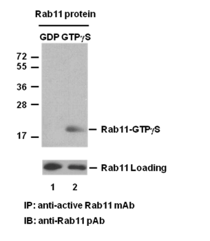 純化的 Rab11 蛋白 用GDP處理 (lane 1) 或 GTPγS (lane 2) 用抗活性的Rab11 進(jìn)行免疫沉淀(Cat. No. 26919).用 anti Rab11 rabbit polyclonal antibody(Cat. No. 21157). 做免疫印跡分析。
