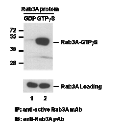 純化的 GST- Rab3A 蛋白(Cat. No. 10128) 用GDP處理 (lane 1) 或 GTPγS (lane 2) 用抗活性的 Rab3 進(jìn)行免疫沉淀(Cat. No. 26920).用