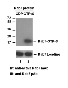 純化的 GST-Rab7 蛋白(Cat. No. 10134) 用GDP處理 (lane 1) 或 GTPγS (lane 2) 用抗活性的Rab7進(jìn)行免疫沉淀(Cat. No. 26923).用 anti Rab7 rabbit polyclonal antibody(Cat. No. 21069). 做免疫印跡分析。