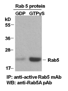 純化的Rab5A蛋白 用GDP處理 (左邊) 或 GTPγS (右邊) 用抗活性的Rab5進(jìn)行免疫沉淀(Cat. No. 26911).用 anti Rab5A rabbit polyclonal antibody(Cat. No. 21036). 做免疫印跡分析。