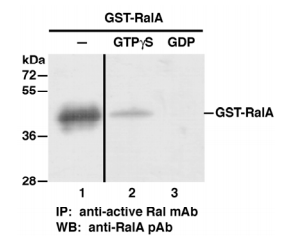 RalA激活試驗(yàn); 純化的GST-RalA蛋白 用GDP處理 (lane 3) 或 GTPγS (lane 2).用 GST-RalA protein (lane 1) 做為對(duì)照。用用抗活性的Ral進(jìn)行免疫沉淀(Cat. No. 26913).用 anti RalA rabbit polyclonal antibody(Cat. No. 21034). 做免疫印跡分析。