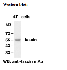 Western blot analysis of fascin proteins. Whole-cell lysate of 4T1 mouse breast tumor cells was used for western blots with the monoclonal anti fascin antibody (Cat # 26012). |