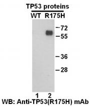 Western blot analysis of recombinant TP53(R175H) and wild type p53 proteins. Purified His-tagged TP53(R175H) protein and wild type p53 protein were blotted with TP53(R175H) rabbit antibody |
