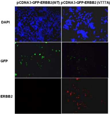 Immunofluorescence of cells expressing ErbB2 proteins with Anti ErbB2(V777A) antibody. HEK293T cells were transfected with pCDNA3-GFP ErbB2 WT plasmid (left column) or pCDNA3-GFP ErbB2(V777A) plasmid (right column), then fixed and stained with Anti ErbB2(V777A) monoclonal antibody (Cat. #26080). |