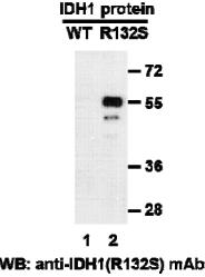 Western blot analysis of recombinant IDH1(R132S) and wild-type proteins. Purified His-tagged IDH1(R132S) protein (lane 2) and wild-type protein (lane 1) were blotted with Anti IDH1(R132S) mouse antibody (Cat. #26160). |