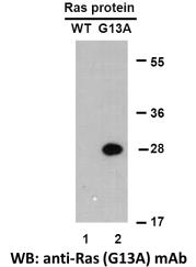 Western blot analysis of recombinant HRAS(G13A) and wildtype proteins. Purified His-tagged HRAS(G13A) protein (lane 2) and corresponding wildtype protein (lane 1) were blotted with Anti HRAS(G13A) monoclonal antibody (Cat. #26191). |