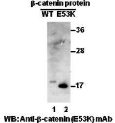 Western blot analysis of recombinant β catenin(E53K) and wildtype proteins. Purified His-tagged β-catenin(E53K) protein (amino acids 1-76, lane 2) and corresponding wild type protein (lane 1) were blotted with anti β catenin(E53K) mouse monoclonal antibody (Cat. #26167). |