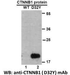 Western blot analysis of recombinant CTNNB1(D32Y) and wildtype proteins. Purified His-tagged CTNNB1(D32Y) protein (lane2) and corresponding wild-type protein (lane1) were blotted with anti-CTNNB1(D32Y) monoclonal antibody (Cat. #26302). |