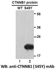 Western blot analysis of recombinant CTNNB1(S45Y) and wildtype proteins. Purified His-tagged CTNNB1(S45Y) protein (lane2) and corresponding wild-type protein (lane1) were blotted with anti-CTNNB1(S45Y) monoclonal antibody (Cat. #26309). |