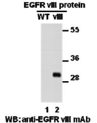 Western blot analysis of recombinant EGFR(vIII) and wildtype proteins. Purified His-tagged EGFR(vIII) protein (partial, lane 2) and corresponding wild type protein (lane 1) were blotted with anti-EGFR(vIII) mouse monoclonal antibody (Cat. # 26176). |