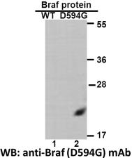 Western blot analysis of recombinant BRAF(D594G) and wildtype proteins. Purified His-tagged BRAF(D594G) protein (lane 2) and corresponding wildtype protein (lane 1) were blotted with Anti BRAF(D594G) monoclonal antibody (Cat. #26200). |