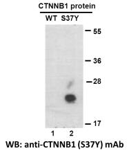 Western blot analysis of recombinant CTNNB1(S37Y) and wildtype proteins. Purified His-tagged CTNNB1(S37Y) protein (lane 2) and corresponding wildtype protein (lane 1) were blotted with Anti CTNNB1(S37Y) monoclonal antibody (Cat. #26296). |