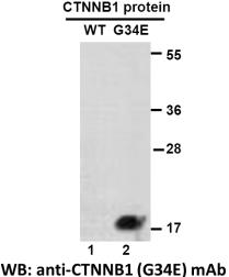 Western blot analysis of recombinant CTNNB1 (G34E) and wildtype proteins. Purified His-tagged CTNNB1 (G34E) protein (lane2) and corresponding wild-type protein (lane1) were blotted with Anti CTNNB1(G34E) monoclonal antibody (Cat. #26300).