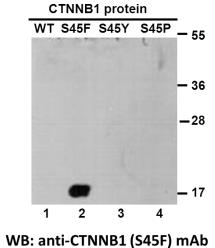 Immunogen: A synthetic peptide from the internal region of CTNNB1 which includes the mutation of S45F, human origin. |
