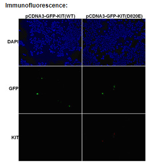Immunofluorescence of cells expressing KIT proteins with Anti KIT(D820E) antibody. HEK293T cells were transfected with pCDNA3-GFP KIT(WT) plasmid (left column) or pCDNA3-GFP KIT(D820E) plasmid (right column), then fixed and stained with anti KIT(D820E) monoclonal antibody (Cat. #26274). |