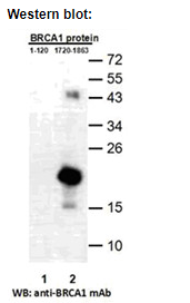 Western blot analysis of recombinant BRCA1(1-120) and BRCA1(1720-1863) proteins. Purified His-tagged BRCA1 1-120) protein (lane1) and corresponding His-tagged BRCA1(1720-1831) (lane2) were blotted with Anti BRCA1(1720-1863) monoclonal antibody (Cat. #26351-2). |
