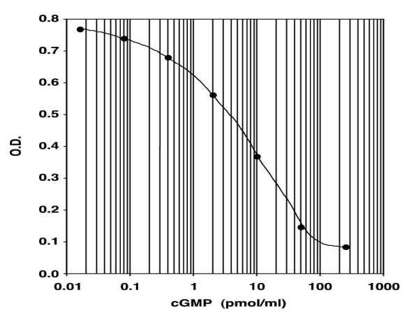 通過比較10個(gè)B0孔平均光密度值(OD)和10個(gè)#6管標(biāo)準(zhǔn)品的平均光密度值,計(jì)算出靈敏度。cGMP濃度的檢測(cè)極限通過標(biāo)準(zhǔn)曲線上0位置的兩個(gè)標(biāo)準(zhǔn)偏差來測(cè)定。
