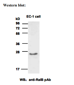 Western blot analysis of RalB proteins. EC-1 cell lysate was used for Western blot with anti RalB polyclonal antibody (cat # 21033). |