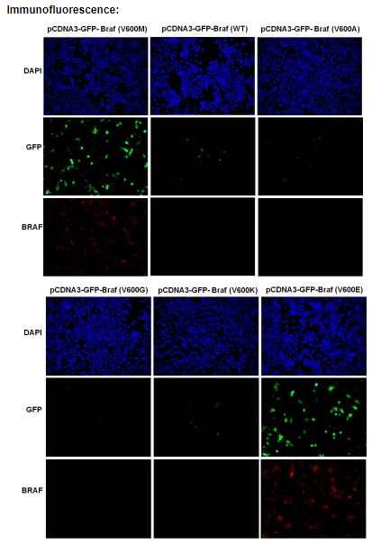 Immunofluorescence of cells expressing BRAF proteins with Anti BRAF(V600M) antibody. HEK293T cells were transfected with pCDNA3-GFP BRAF(V600M) plasmid, pCDNA3-GFP BRAF(WT) plasmid, pCDNA3-GFP BRAF (V600A) plasmid, pCDNA3-GFP BRAF(V600G) plasmid, pCDNA3-GFP BRAF(V600K) plasmid or pCDNA3-GFP BRAF (V600E) plasmid , then fixed and stained with Anti BRAF(V600M) monoclonal antibody (Cat. #26462). |