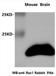 Mouse Brain tissue (20ul,1mg/ml) was used for western blots with the polyclonal anti Rac1 antibody (cat # 21003). at dilution 1:800. |