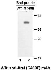 Western blot analysis of recombinant BRAF (G469E) and wildtype proteins. Purified His-tagged BRAF (G469E) protein (lane 2) and corresponding wildtype protein (lane 1) were blotted with Anti BRAF(G469E) monoclonal antibody (Cat. #26196). |