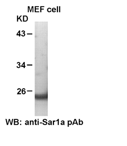 Western blot analysis of Sar1a proteins. MEF whole-cell lysates were used for Western blot with anti Sar1a rabbit polyclonal antibody (Cat# 21090). |